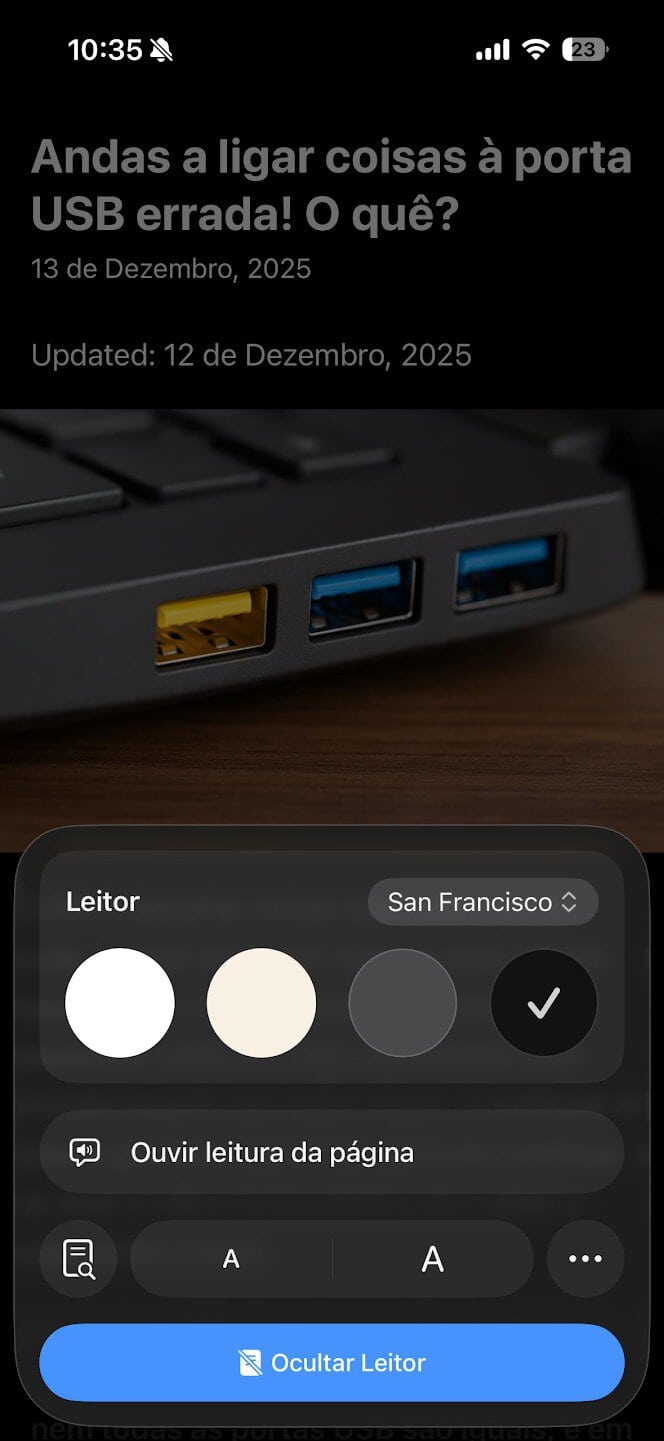 Como fazer: Com o Leitor ativo, toca novamente no ícone das definições na barra de endereço. Vai aparecer um menu onde podes escolher cores de fundo (como sépia ou preto), tipos de letra e tamanho do texto.