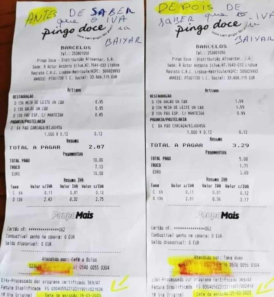 Portanto, depois do anúncio, os consumidores decidiram ficar um pouco mais atentos às suas faturas, em cada compra. Com um exemplo a saltar à vista nas redes sociais como o Reddit e Twitter. Afinal de contas, neste caso, em apenas 7 dias, a fatura com os mesmos exatos produtos de cafeteria, aumentou de 2.87€ para 3.29€. Um aumento agressivo em produtos como ‘meia de leite’, ‘pão com manteiga’, ‘galão’ e uma ‘carcaça’. (O único que não aumentou foi a carcaça)