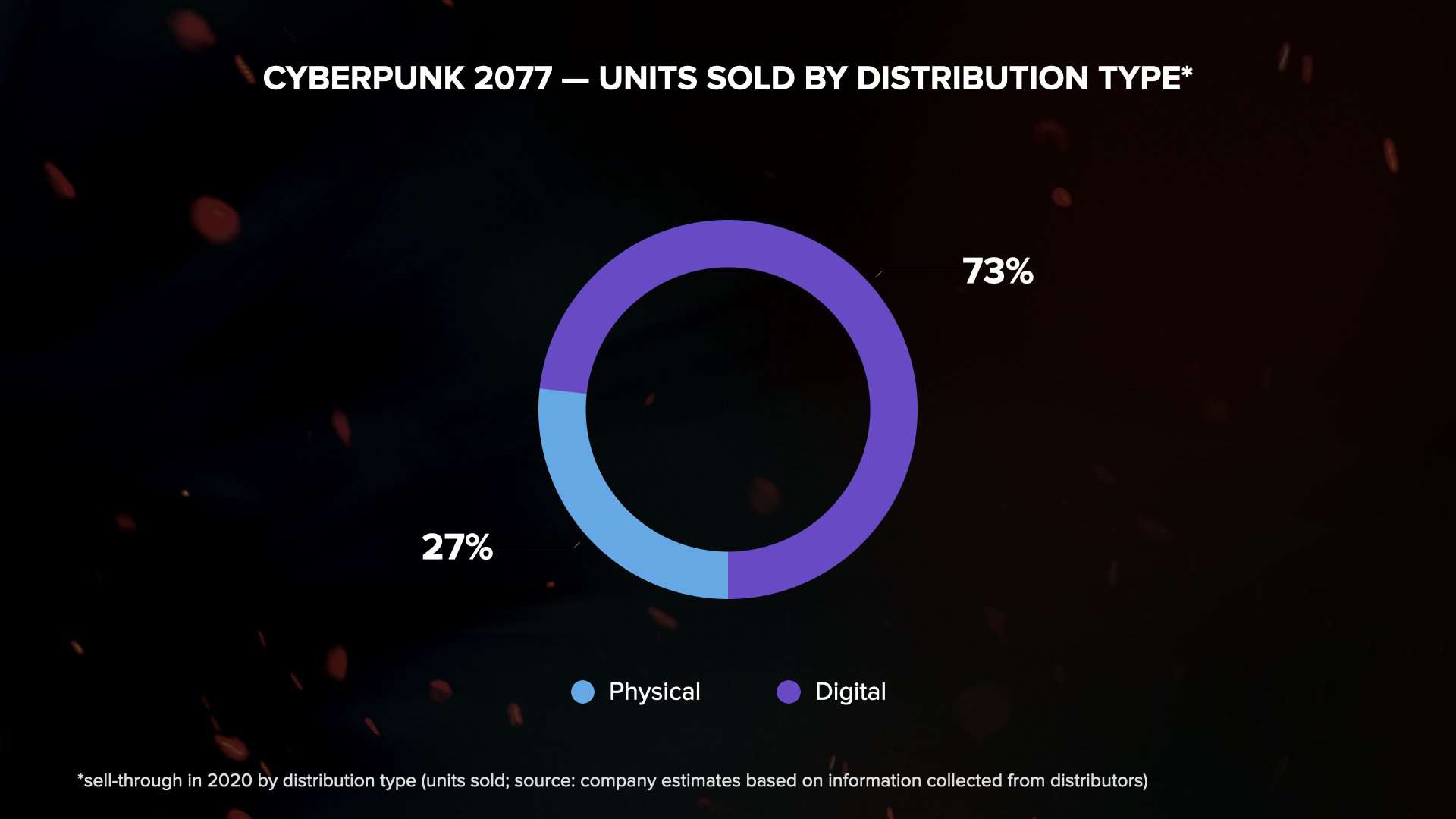 Entretanto, 73% ou 10 milhões de cópias de Cyberpunk 2077 foram vendidas digitalmente. Curiosamente, se assumirmos que todas as vendas de PCs foram digitais, temos um valor mínimo de 38% para as consolas.