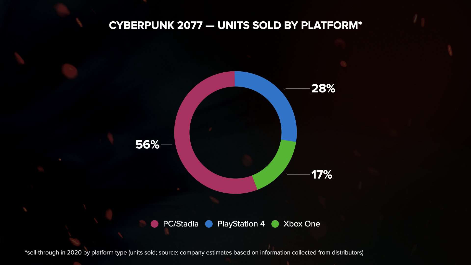 Cyberpunk 2077 vendeu mais de 13.7 milhões de unidades para todas as plataformas. Ou seja, 56% ou 7,67 milhões de cópias vendidas no PC. 28% ou 3,84 milhões de cópias vendidas no PS4/PS5. E por último, 17% ou 2,33 milhões de cópias vendidas na Xbox One. São percentagens que não surpreendem, tal era o hype à volta do jogo.