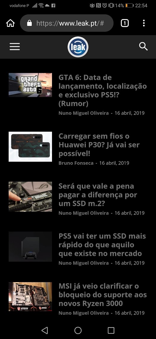 Na parte superior têm logo a caixa de pesquisa e um resumo das principais notícias logo abaixo. Um aspeto de que gostámos muito foi o modo escuro integrado. É que abrange as páginas que visitamos. Ora vejam como fica a Leak.