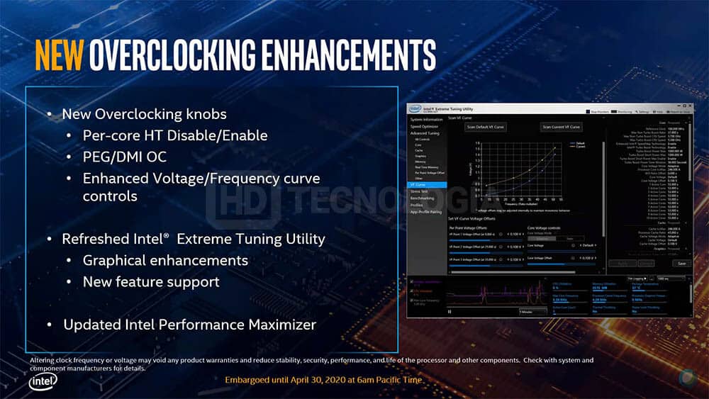 Posteriormente temos logo um outro slide que revela tudo aquilo que podemos encontrar de novo nestes processadores, a começar com a introdução da ‘Intel Thermal Velocity Boost’, a expansão da tecnologia MultiThreading a todas as gamas de processadores (tal como a AMD), suporte nativo a memória DDR4-2933, novas funcionalidades de OC, bem como uma nova plataforma I/O graças ao chipset Z490.