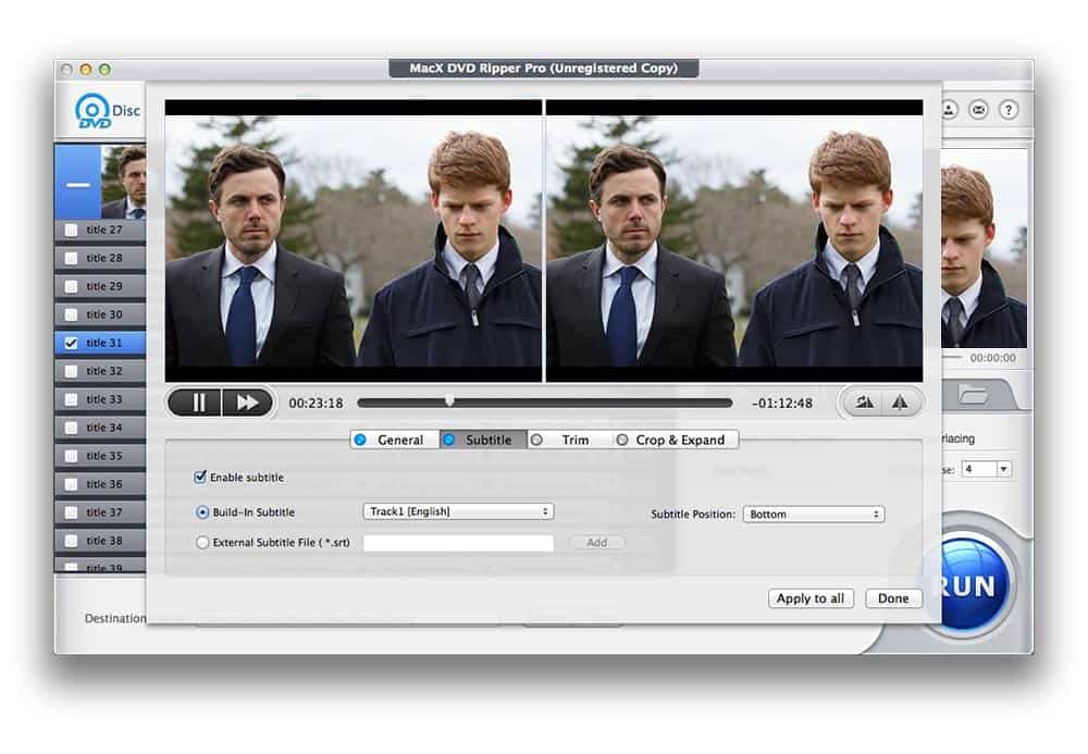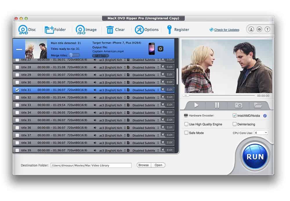 Ao seleccionar “Run” o MacX DVD Ripper Pro coloca em acção o seu mecanismo avançado de desencriptação e transcodificação. Contudo, a velocidade vai depender do sistema individual de cada utilizador. E claro, da velocidade do leitor de DVD e do DVD que se está a tentar extrair.