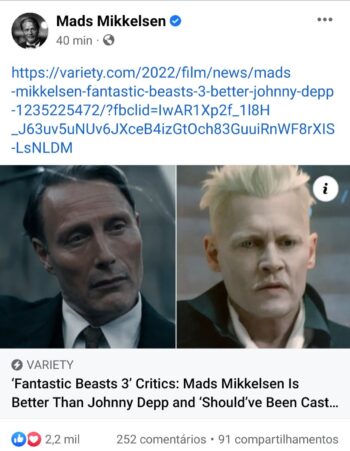 Portanto, muito resumidamente, o novo Grindelwald partilhou, no Facebook, um artigo da revista Variety, que por sua vez falava desta troca de atores! Com o título “Mads Middelsen é melhor que Johnny Depp. Devia ter sido a primeira escolha.”