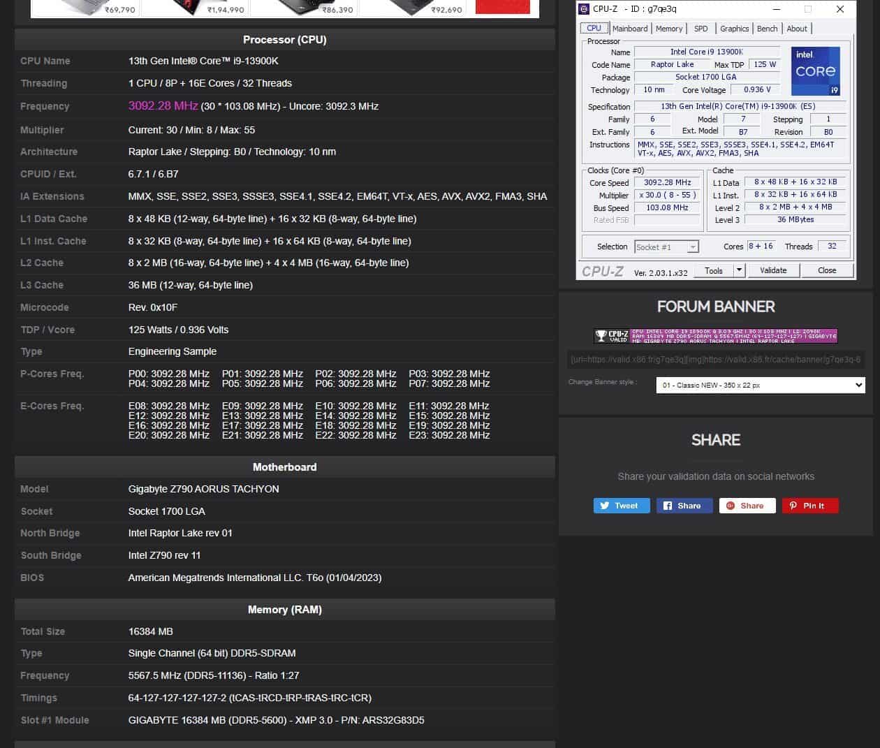 Estamos a falar de um módulo único de 16GB (GIGABYTE AORUS DDR5), numa motherboard GIGABYTE Z790 AORUS Tachyon, a contar com um processador Core i9-13900K.