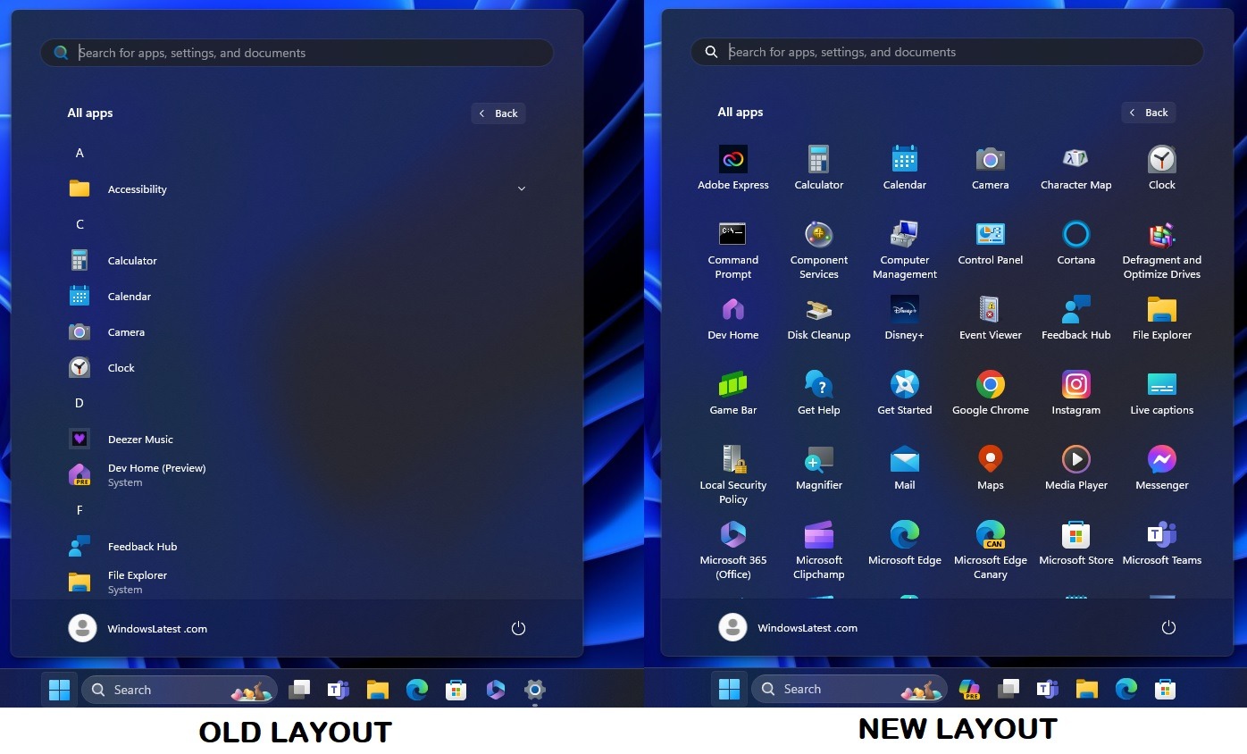Com o Windows 11, a Microsoft abandonou os blocos dinâmicos para ícones estáticos, pois a empresa queria que o menu Iniciar fosse simples. Nas compilações estáveis, quando acede a todas as aplicações “vê uma lista de todos os programas instalados organizados em ordem alfabética, tornando mais fácil encontrar a aplicação de que está à procura”.