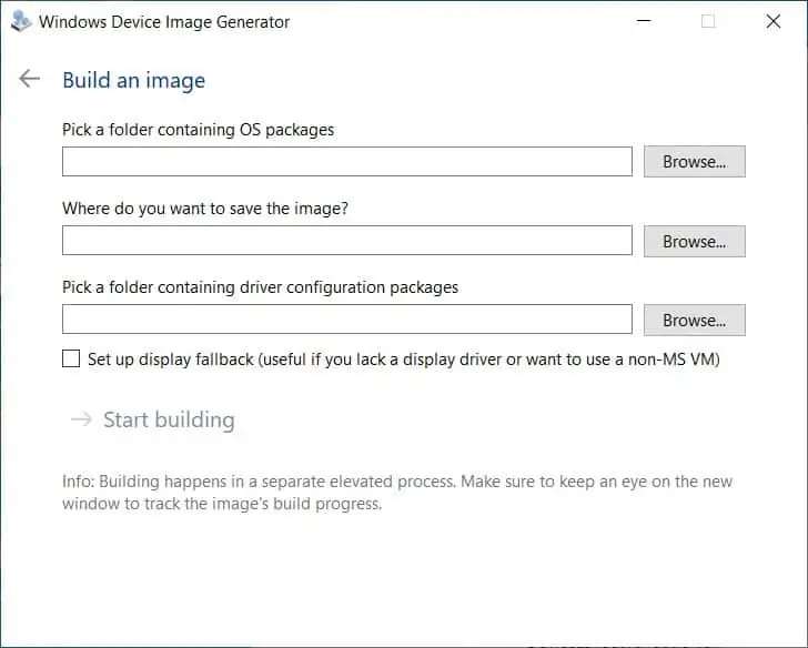 Para além disso, o utilitário cria um conjunto de pacotes de configuração que são necessários para construir a imagem final. Atenção que este sistema não descarrega a build do Windows 10X. Vai precisar de a ter no seu computador. Assim tem de fazer o download primeiro da versão que anda pela Internet.