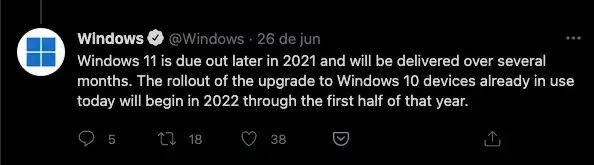 De acordo com uma publicação da Microsoft no Twitter, a disponibilização do Windows 11 para os utilizadores do Windows 10 só vai começar na primeira metade de 20202. E esta disponibilização vai-se arrastar ao longo dos meses. Assim, os novos dispositivos que terão direito ao Windows 11 este ano serão os novos computadores.