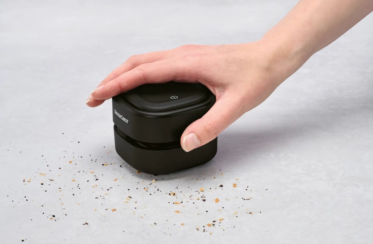 Com medidas reduzidas (82 x 82 x 64 mm), este mini aspirador encaixa-se perfeitamente na palma da mão. Apesar do tamanho discreto, tem potência suficiente para remover: