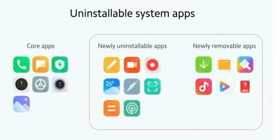 Agora, juntamente com a aplicação de meteorologia, a bússola, a app de notas da Xiaomi, entre outras, os utilizadores também podem remover a app de música por defeito e até mesmo o explorador de ficheiros. Entretanto as aplicações centrais que não podem ser desinstaladas podem, pelo menos, ter os seus ícones escondidos.