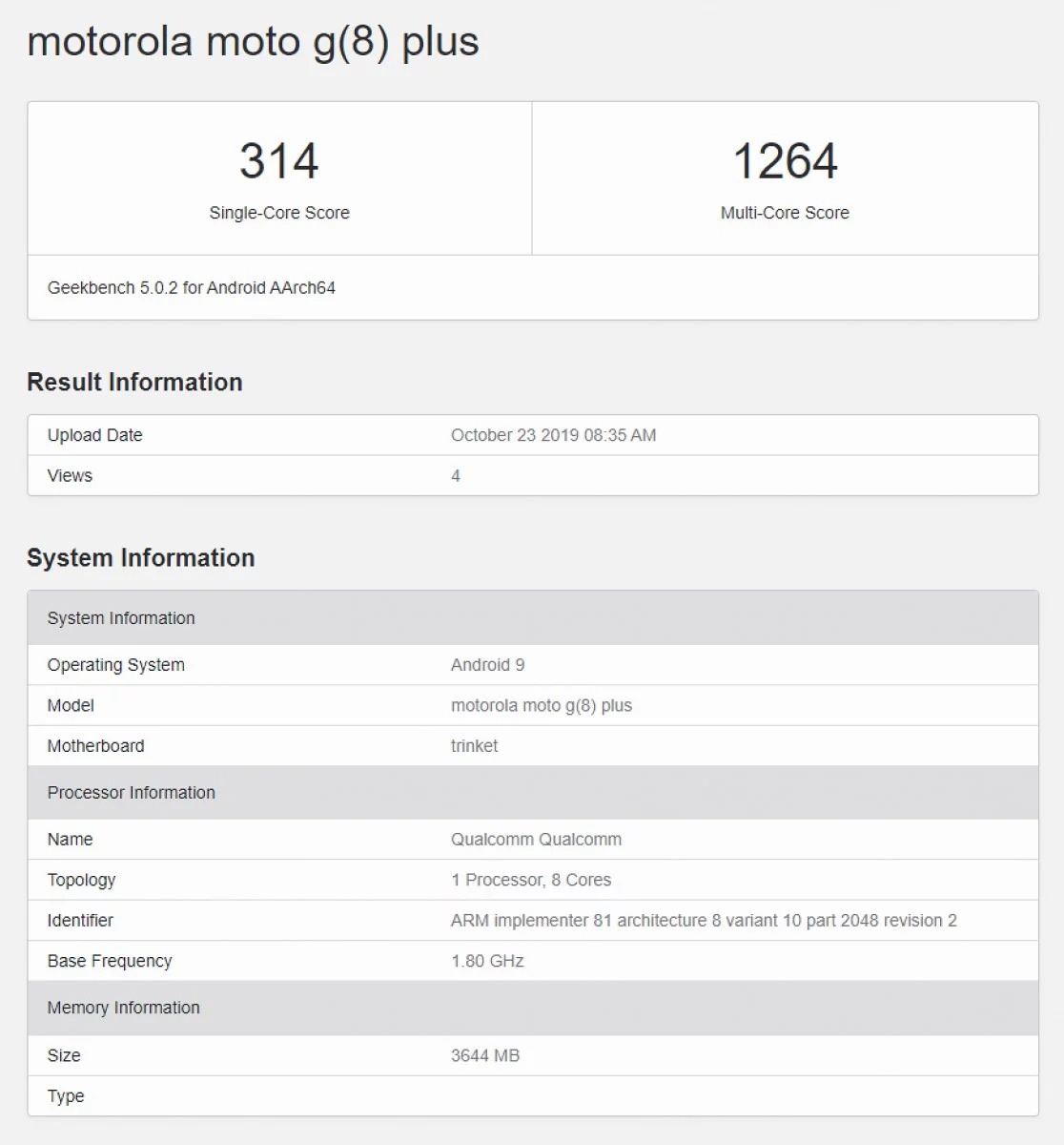 Na imagem a seguir que revela os benchmarks do Moto G8 Plus no Geekbench 5, confirma-se o chipset “trinket” que se refere ao Snapdragon 665. O chipset que possui uma frequência base de 1,80GHz junta-se a 4 GB de RAM. Este smartphone executa o Android 9 Pie OS. No teste de núcleo único, marcou 314 pontos. Entretanto, no multi-núcleos registou uma pontuação de 1264 pontos.
