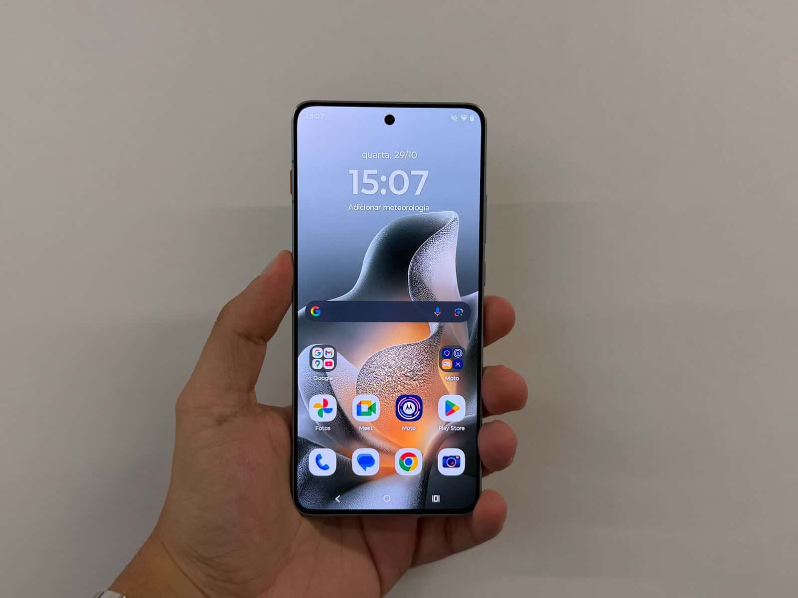 De fábrica vem com Android 16 e a interface limpa da Motorola, que mantém o sistema próximo do Android puro, mas com extras úteis como gestos rápidos, controlo por voz e modo Ready For.