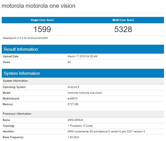 A listagem no Geekbench do Motorola One Vision revela que este dispositivo executa o sistema operativo Android 9 Pie. Ao chipset da Samsung juntam-se 6 GB de RAM.