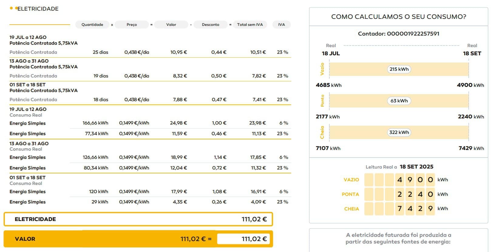 Na primeira fatura pode haver um período “quebrado” (ex: 20 dias num mês, 40 noutro) por causa da transição. Isso não significa que estejas a pagar a dobrar. Mas convém confirmar se o consumo real bate certo com a leitura do contador.