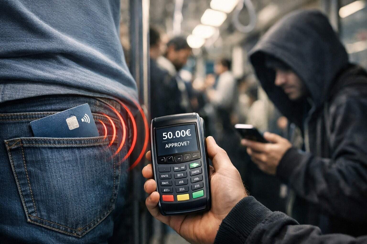 A tecnologia NFC (Near Field Communication) que equipa o teu cartão de multibanco foi desenhada para funcionar a curta distância. Contudo, burlões equipados com amplificadores de sinal ou terminais de pagamento (TPA) configurados ilegalmente conseguem ler o teu cartão através do tecido das calças ou da mala.