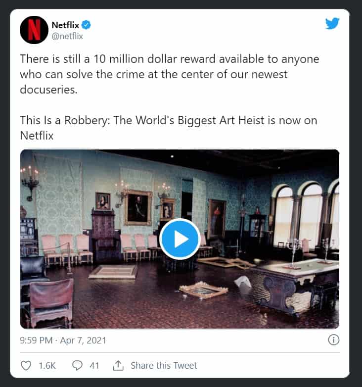 Há uma recompensa de 10 milhões de dólares disponível para qualquer um que possa resolver o crime do maior roubo de arte do mundo” – disse a Netflix na sua pagina oficial no Twitter. Mas a recompensa é mesmo real!