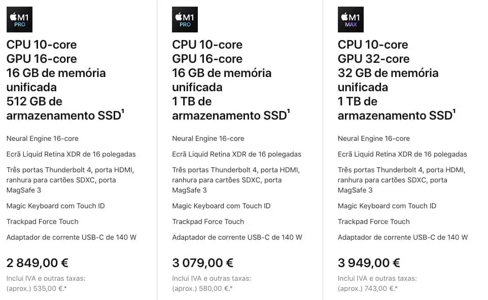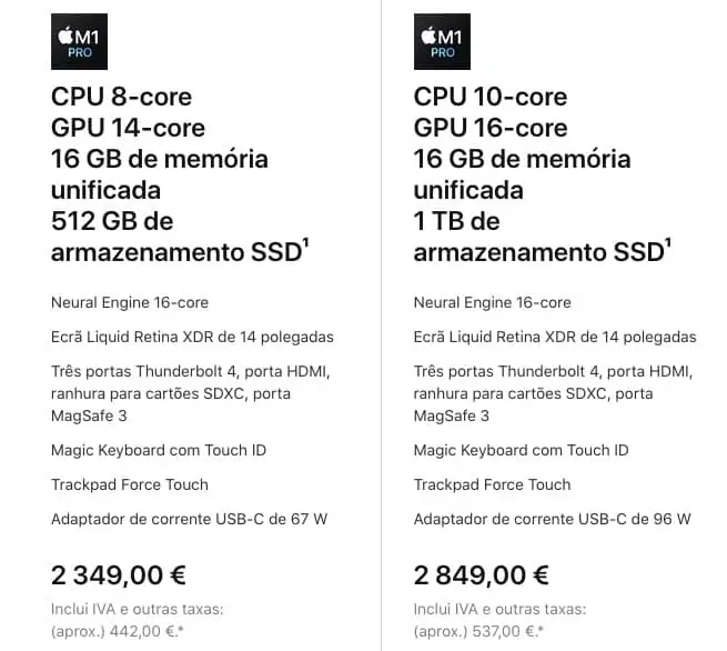 No caso do Macbook Pro de 16 polegadas custam 2849 Euros, no caso da versão com chip M1 Pro e 512GB de armazenamento.