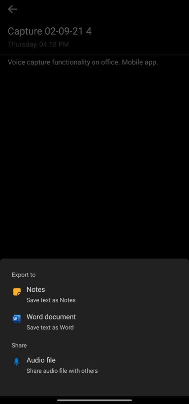 Mas há mais novidades para além dos PDFs. Dito isto, é possível exportar as transcrições criadas pelo Office para as Notas em mais de 20 idiomas. Assim esta é uma função muito importante do Office para Android. Dizemos algo e e ele em tempo real passa para texto o que acabámos de dizer. Agora é possível exportar esse texto para as Sticky Notes de modo a que possam ser utilizadas no ecossistema do Office 365. Para esse efeito basta utilizar o menu de três pontos, escolher partilhar e exportar para as notas.