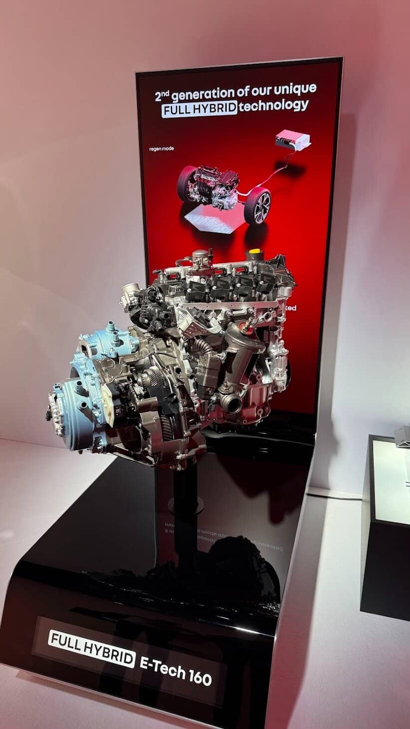 E-Tech 160 (full hybrid) – 1.8 Atkinson + 2 motores elétricos | 160 hp | 3,9 l/100 km | 89 g CO₂/km | 0–100 km/h: 8,3 s | caixa multimodo sem embraiagem.