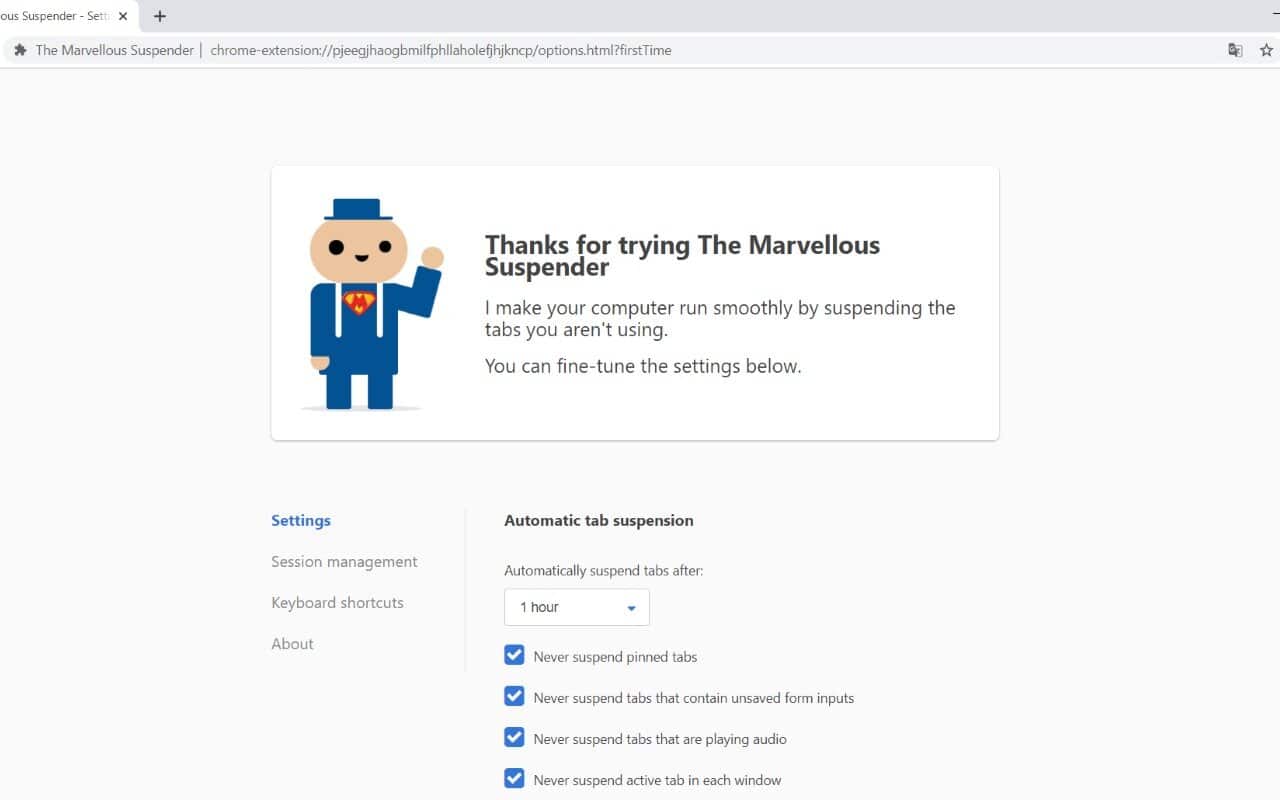 Lembras-te do famoso The Great Suspender? Esta é a versão segura e focada na privacidade, sem o malware que matou o original. O The Marvelous Suspender faz exatamente o que promete: suspende automaticamente os separadores após um período de inatividade que tu defines (de 5 minutos a 12 horas).