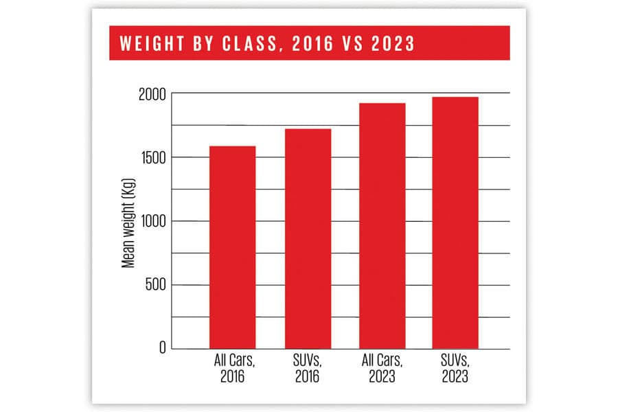 De forma mais concreta, em 2016, os testes realizados indicam que os SUVs e crossovers daquele ano tinham um peso médio de 1722 kg. Ou seja, praticamente 169 kg a mais que os restantes veículos no mercado.