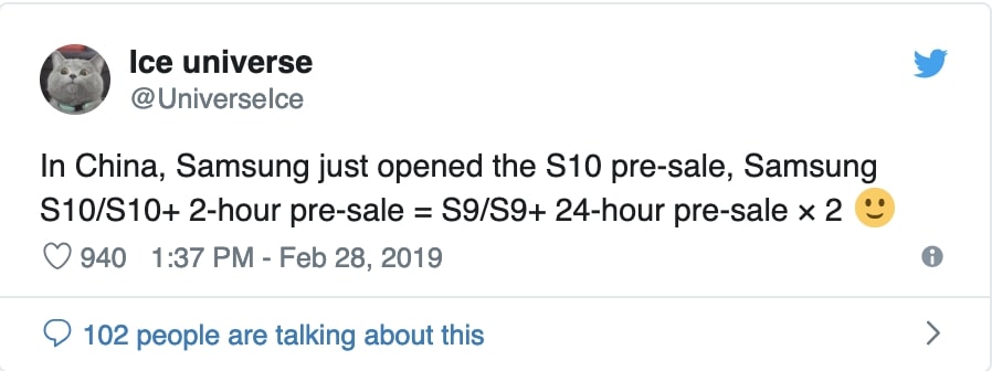 As pré-encomendas do Galaxy S10 começaram na quinta feira passada na China. E se o último Tweet de Ice Universe for levado à letra, então parece que a nova geração vai ultrapassar muito facilmente as vendas dos antecessores.