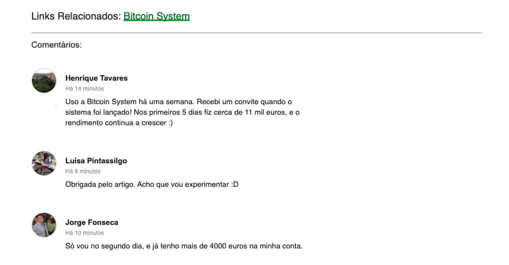 Entretanto e para tornar tudo ainda mais credível no final da notícia temos comentários de utilizadores que já utilizaram e até já ganharam bastante dinheiro.
