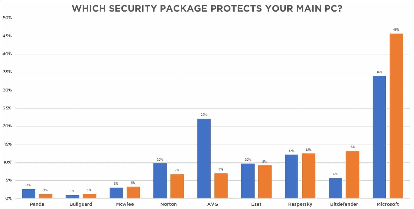 Portanto, como pode ver no gráfico em cima, o AVG era o anti-vírus mais popular do mercado em 2013! Sofrendo uma queda gigantesca nos últimos anos. Curiosamente, algumas das soluções mais conhecidas não perderam assim tantos fãs, mas é visível que os consumidores dão cada vez menos importância a uma solução ‘Premium’ de segurança, atirando-se para os braços da Microsoft e do seu Windows Defender! Ao fim ao cabo, o anti-vírus gratuito da Microsoft subiu dos 34% para os 46%.