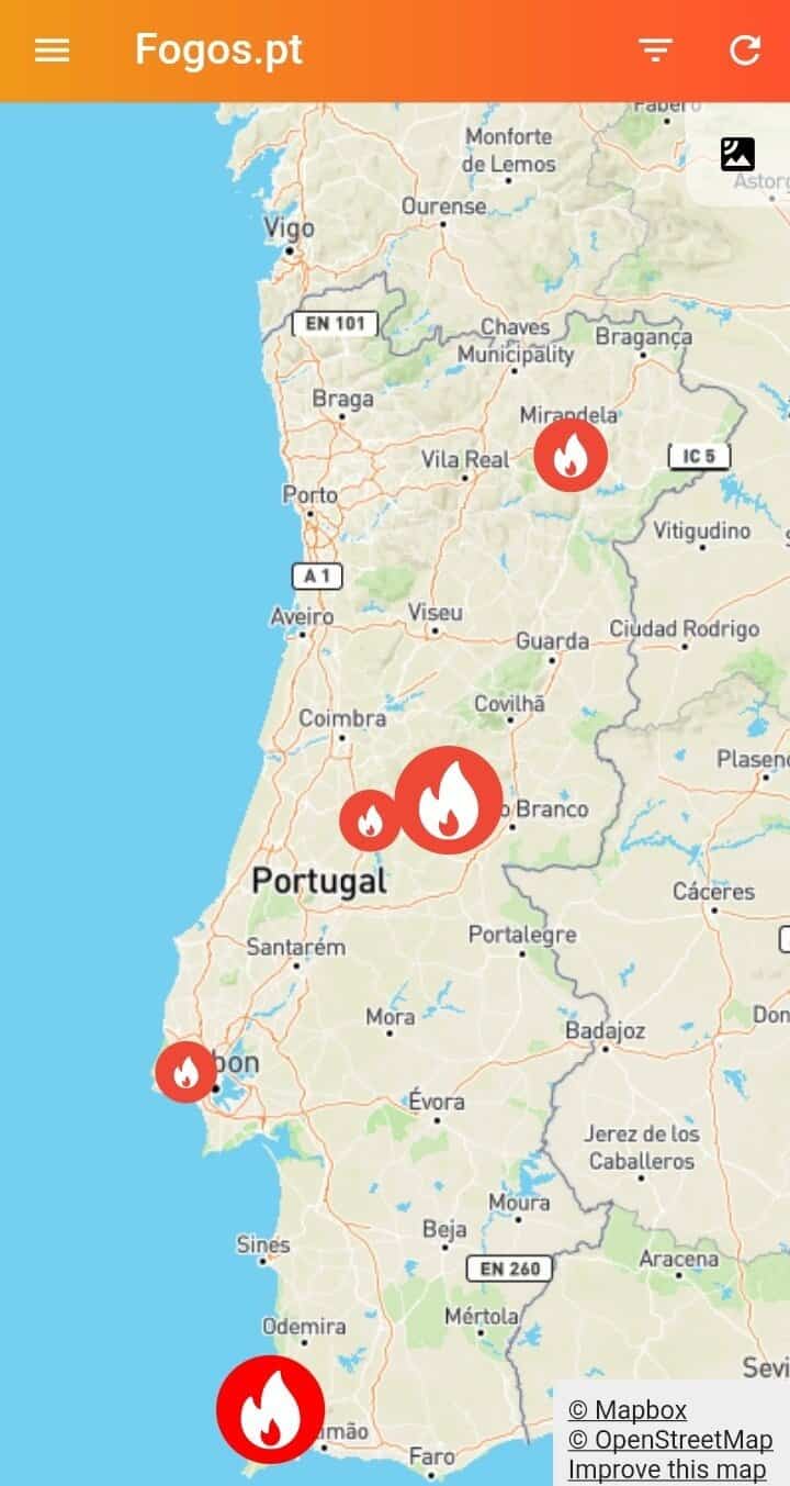 Aliás, há também que dizer que a sua funcionalidade é incrível. É um site leve, rápido, e mostra logo o que interessa, ou seja, um mapa com todos os incêndios ativos em Portugal. Isto com dados em tempo real da Proteção Civil.