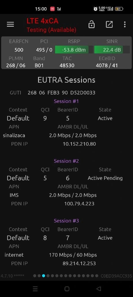 Com um realme X50 Pro 5G e a app Network Signal Guru, usando um cartão de uma marca low cost da MEO (UZO), foram detetadas: