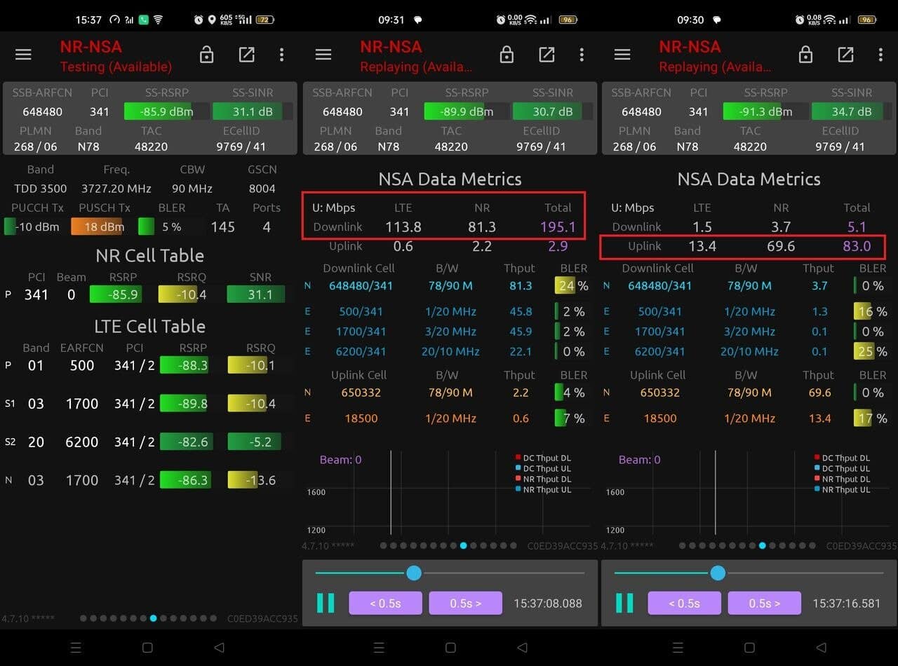 • 5G n78: ~195 Mbps de download / 83 Mbps de upload