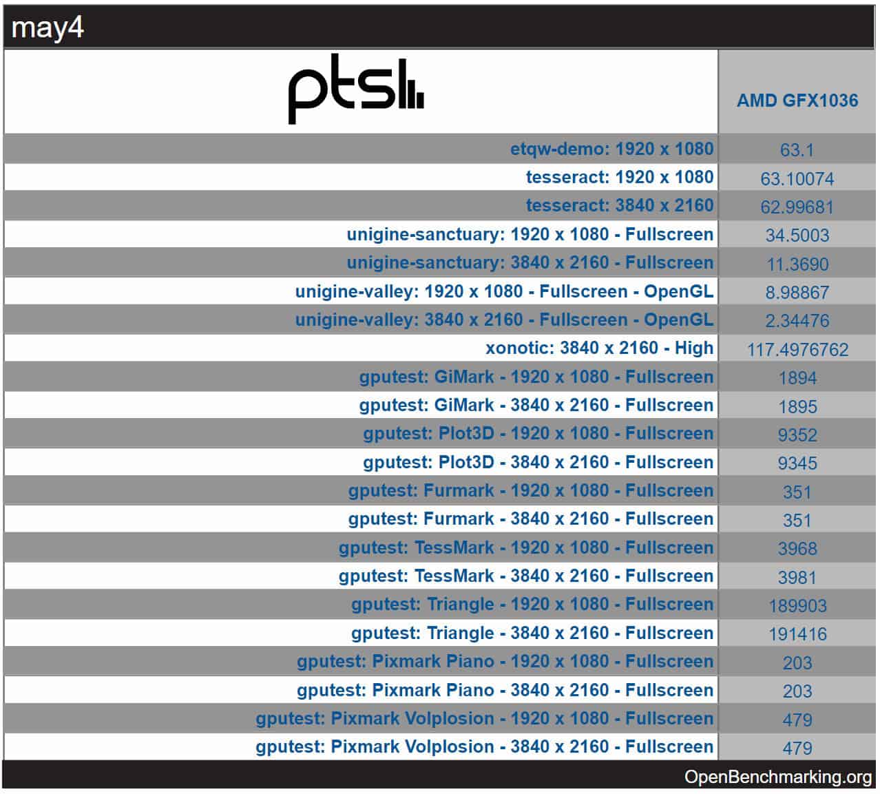 Dito isto, o GPU em teste tem o modelo número GFX1036, ou seja, é baseado na arquitetura gráfica RDNA 2. Contudo, temos de salientar que é uma versão extremamente limitada de um GPU RDNA 2, pensada apenas para produtividade ou consumo leve de multimédia.