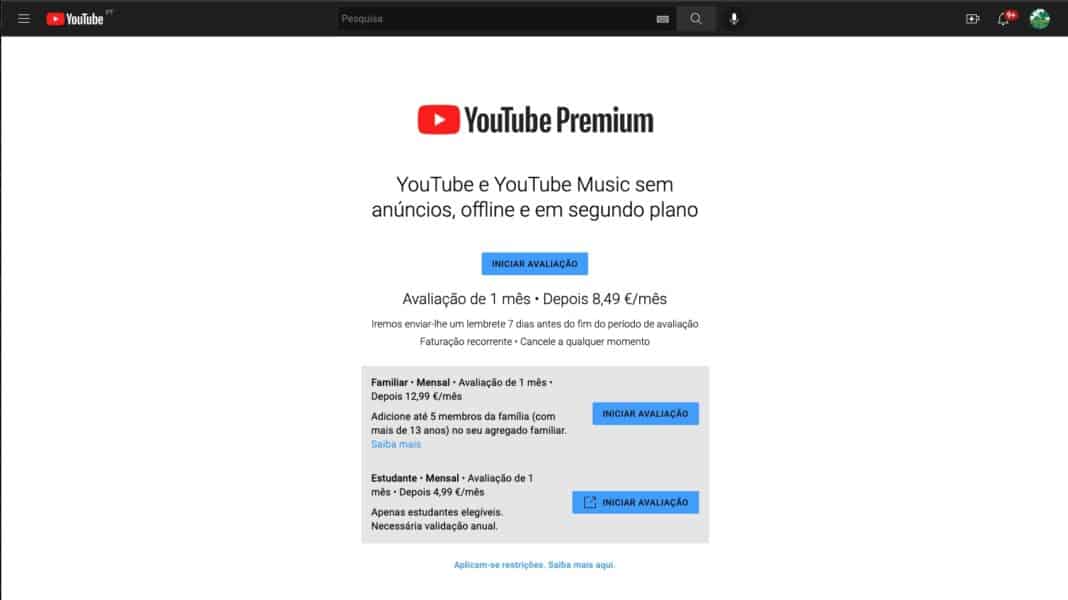 Se pretender aderir ao YouTube Premium saiba que no primeiro mês não vai pagar nada. No entanto, a partir daí terá um custo de 8,49 Euros por mês. Entretanto há também um plano familiar que custa 12,99 Euros por mês mas dá para 5 elementos da família. Por fim quem estuda tem direito a uma subscrição por 4,99 Euros por mês.