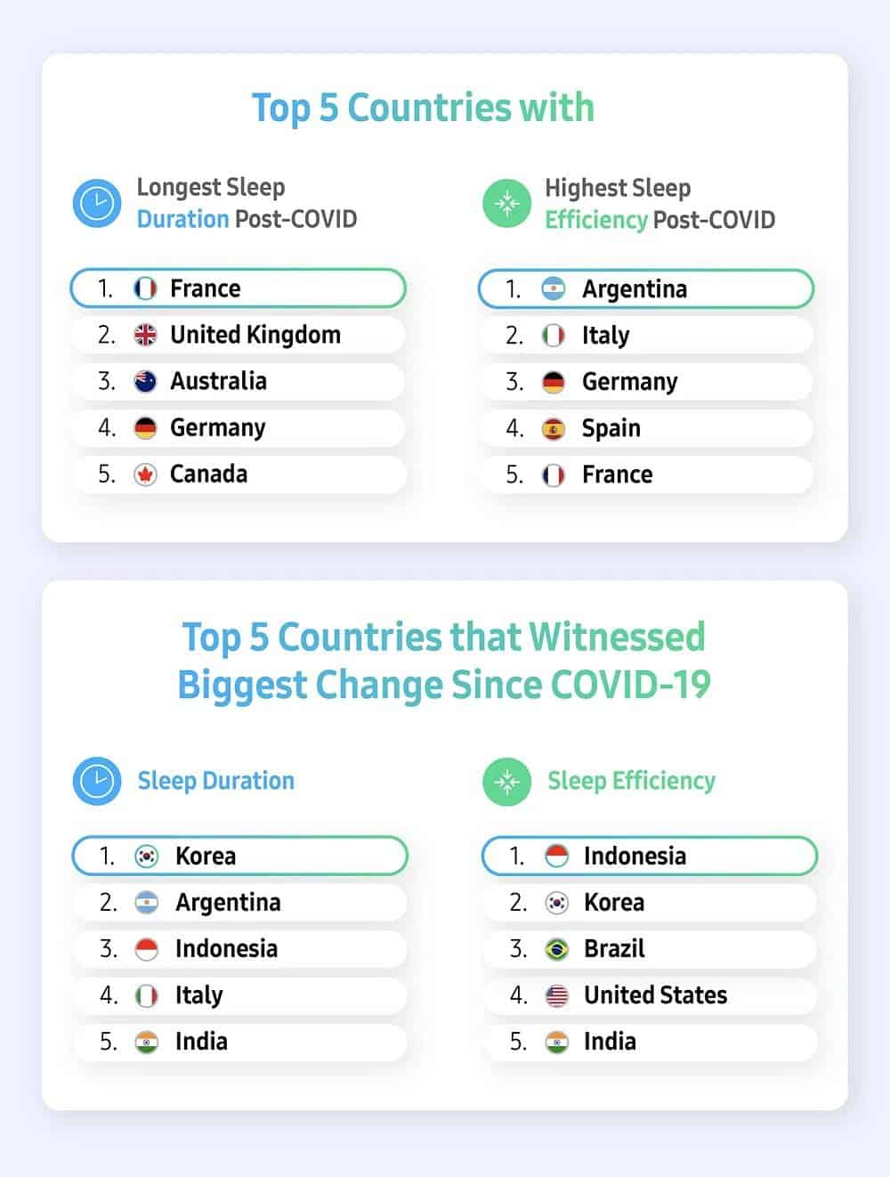 Através do Samsung Health, a empresa disse que “empreendeu um mergulho profundo” em 16 países para determinar como a duração e eficiência do sono mudaram durante a pandemia COVID-19. Os países incluem França, Coreia, EUA, Alemanha, Argentina, Indonésia, Vietname e México.