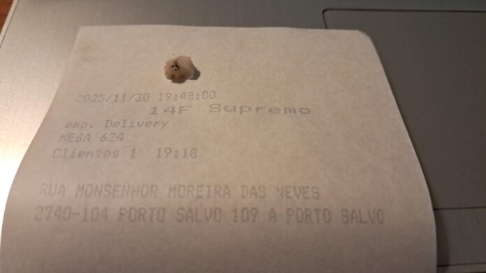 Nas fotos que nos enviou é possível ver um pequeno fragmento esbranquiçado, com o formato típico de coroa dentária, pousado em cima do talão da encomenda. A peça foi retirada diretamente da pizza, garante a leitora.