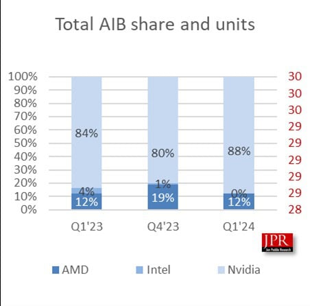 Portanto, segundo o mais recente estudo de mercado da JPR, a NVIDIA, apesar de estar envolvida num mercado que está em queda, conseguiu enviar mais produto para as prateleiras, e por isso subiu para uns incríveis 88% de quota de mercado. A AMD fica pelo 12%, enquanto a Intel baixou para uns desapontantes 0%.
