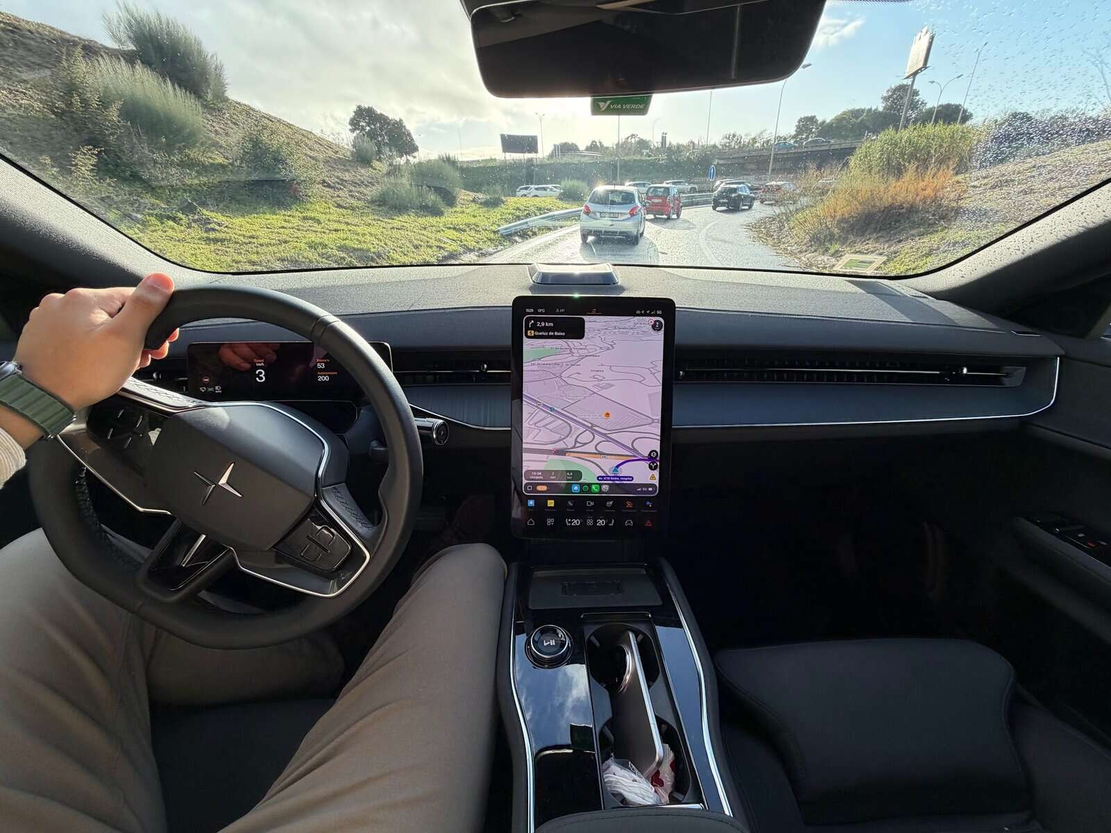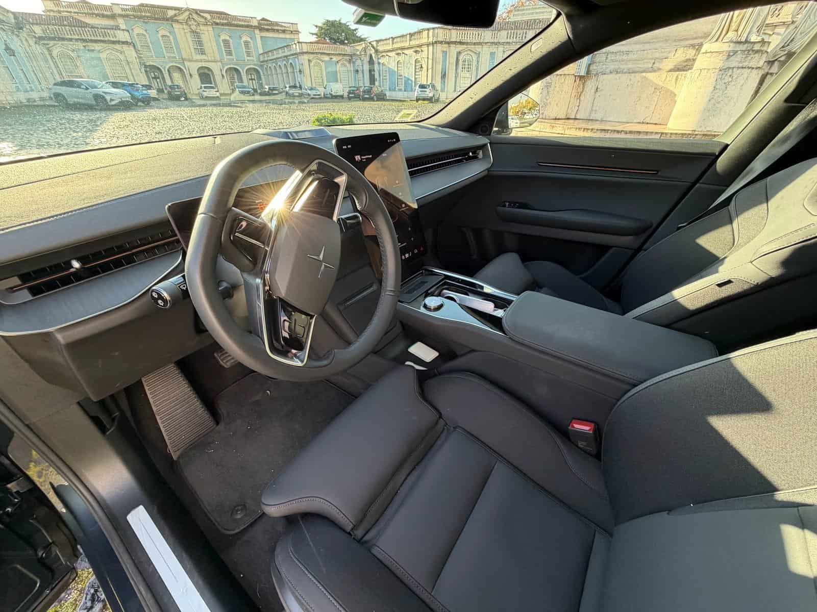 A Polestar aposta forte na sustentabilidade. Materiais reciclados, tecido “animal welfare wool”, acabamentos sólidos e um ambiente clean que grita Volvo. Os bancos são excecionais! Firmes, ergonómicos e com apoio de primeira.
