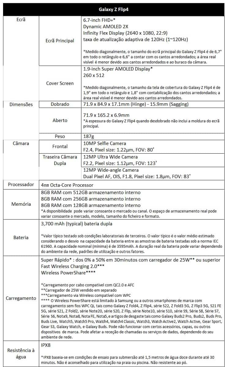 Afinal de contas, temos melhorias no processador, no ecrã, no módulo de câmeras traseiro, no peso e grossura, e também na robustez do design. Além de tudo isto, temos um acréscimo incrível de 400mAh na capacidade da bateria! O que em conjunto com o uso de um processador Snapdragon 8+ Gen1, deverá significar um aumento de autonomia muito significativo. Um dos calcanhares de Aquiles do por si já muito interessante Z Flip 3.