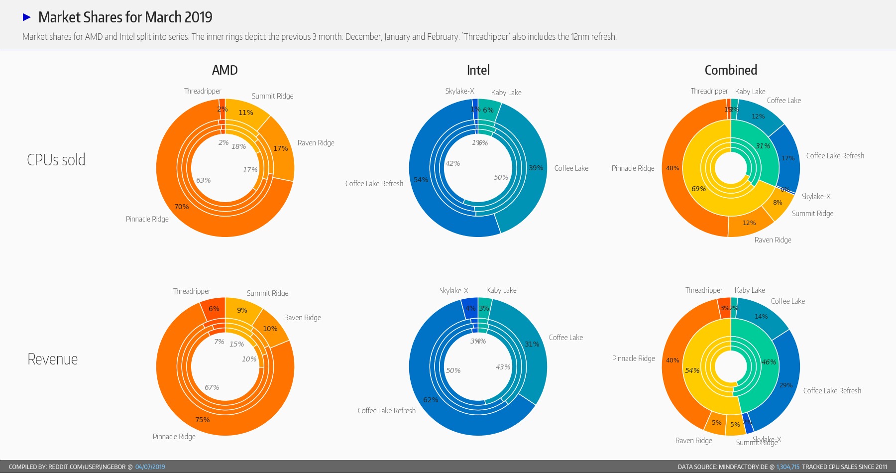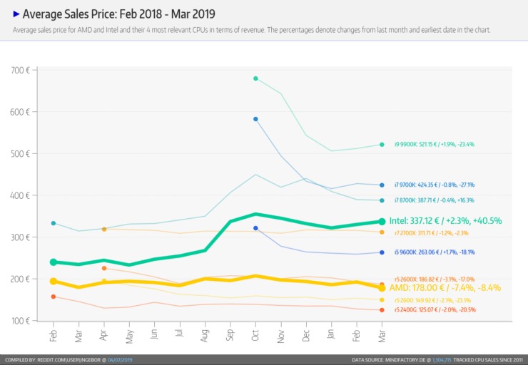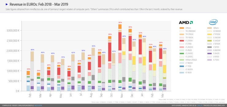 Portanto, graças a isto, a MindFactory relata que dentro da totalidade de vendas de processadores, 69%(~13.000 unidades) pertencem a produtos AMD. Ao mesmo templo, a Intel vendeu apenas 31% (~6000 unidades).