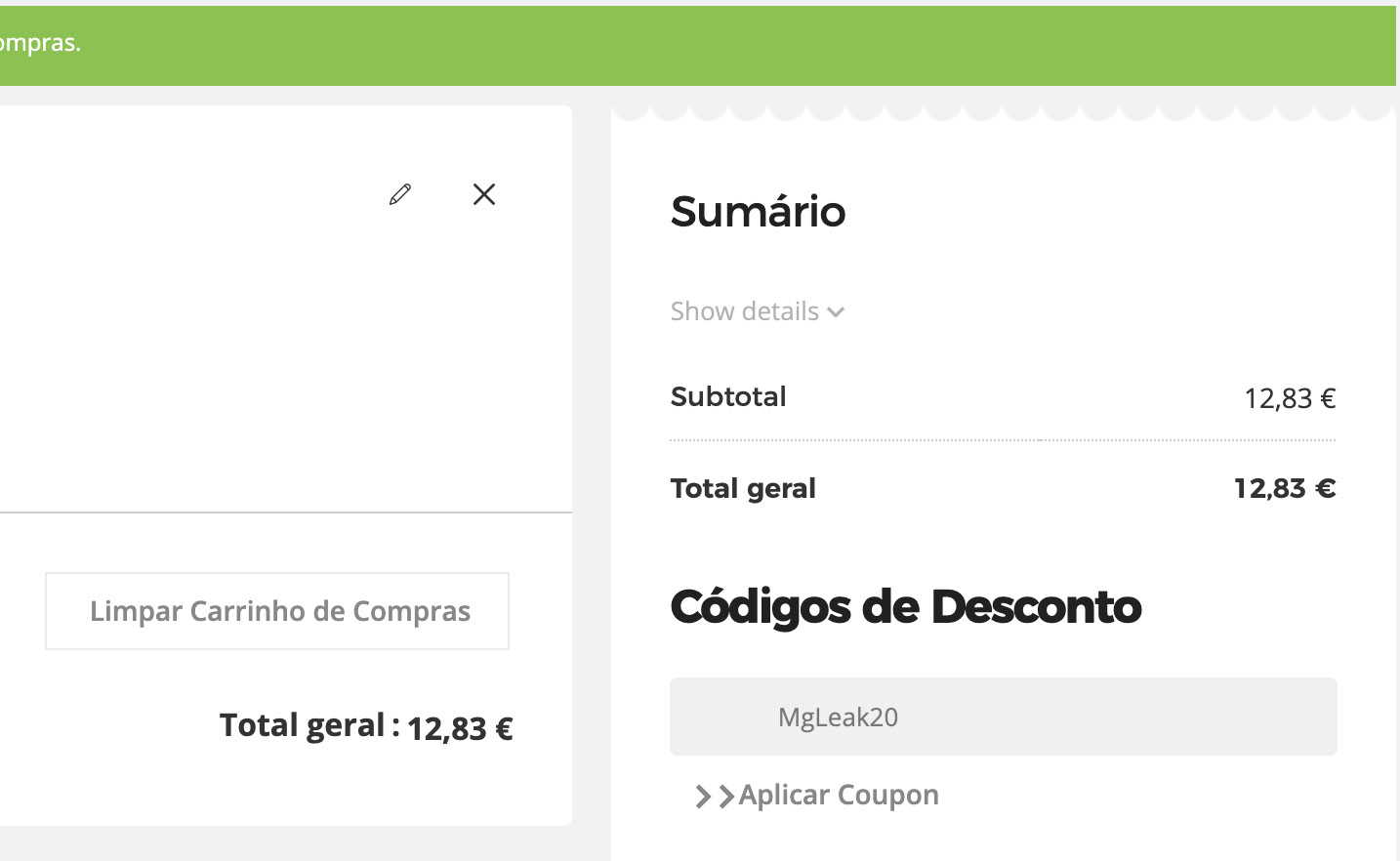 Assim que tivermos concluído este passo e de estarmos no carrinho, só temos de ir à secção Código de Desconto e introduzir MgLeak20. Logo a seguir só temos de dar um clique em Aplicar Coupon. O desconto de 20% será aplicado de imediato.