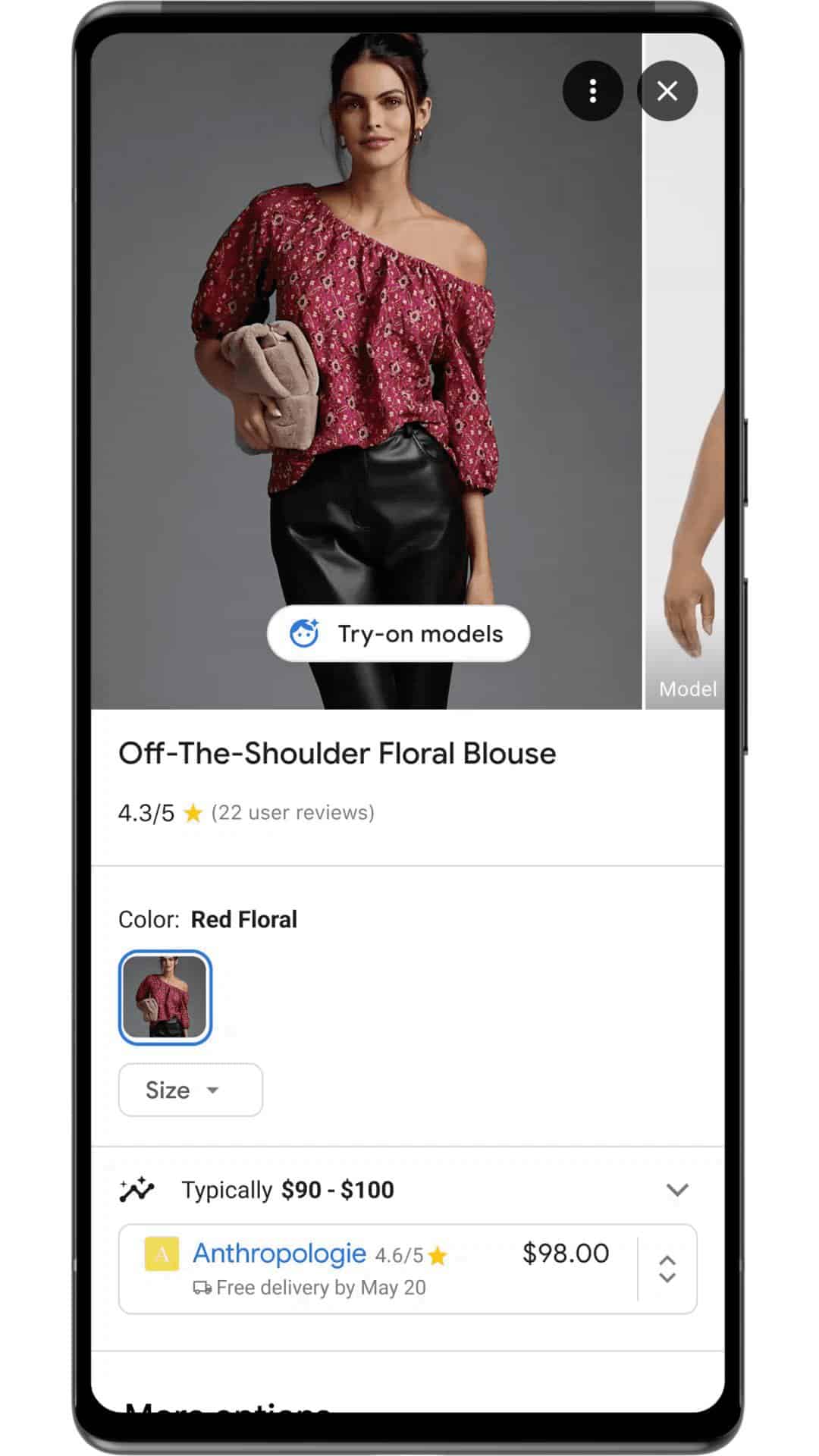 A Google anunciou uma nova funcionalidade, para já, destinada aos compradores norte-americanos que pretendem experimentar roupa de senhora de marcas como Anthropologie, Everlane, H&M e LOFT. A partir de agora, pode tocar no emblema “Experimentar” e ver como a roupa fica num modelo parecido consigo.