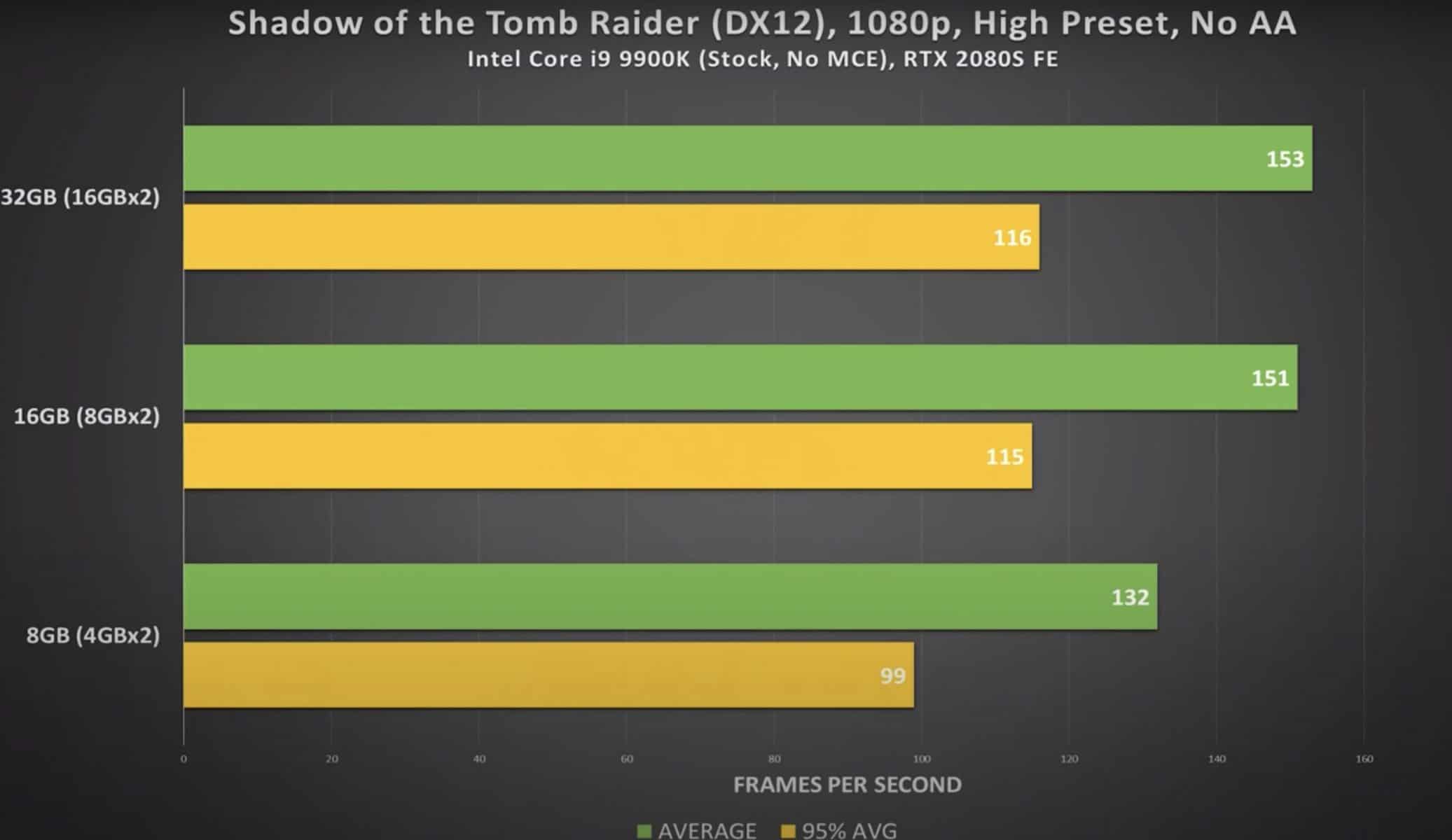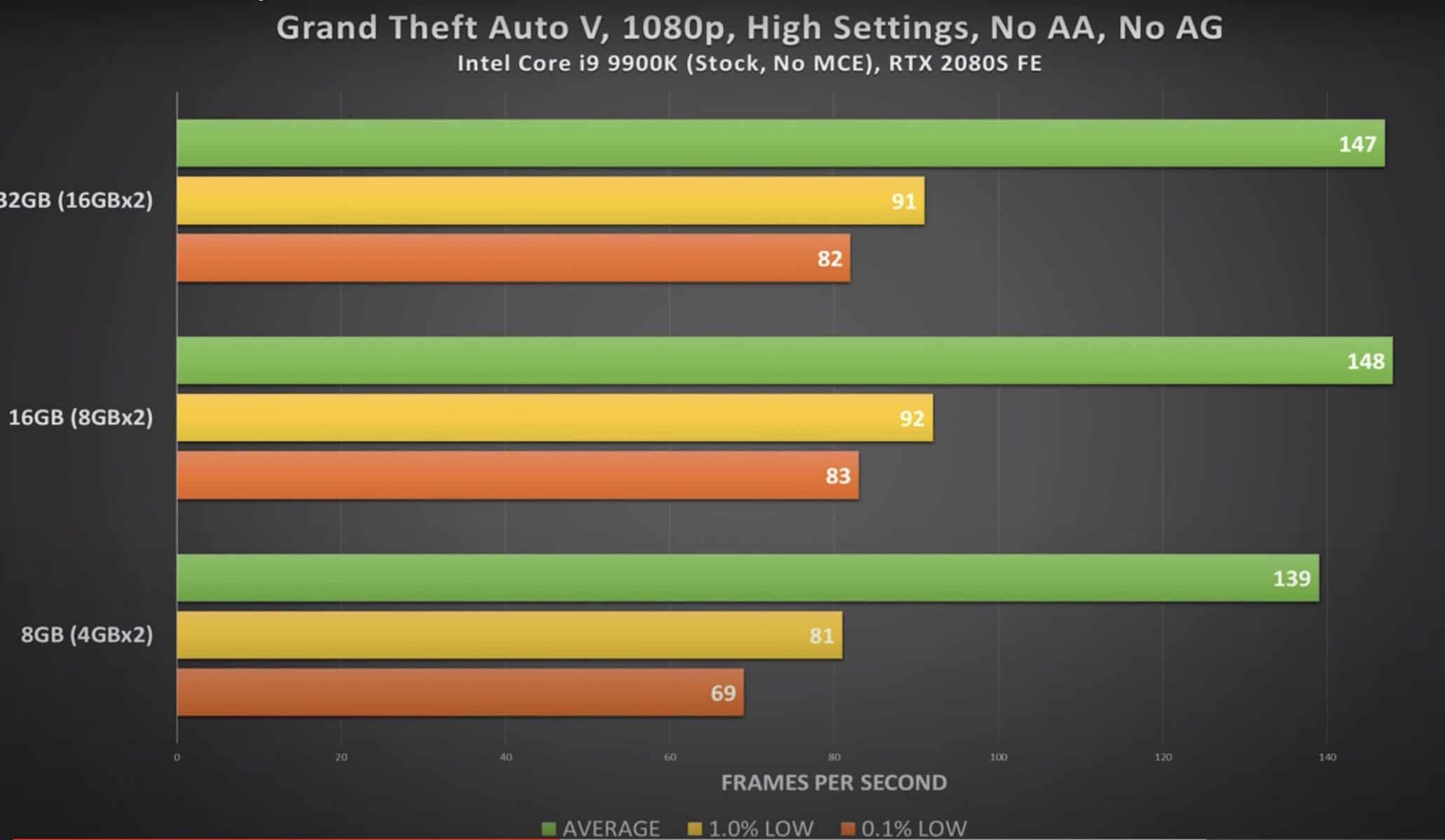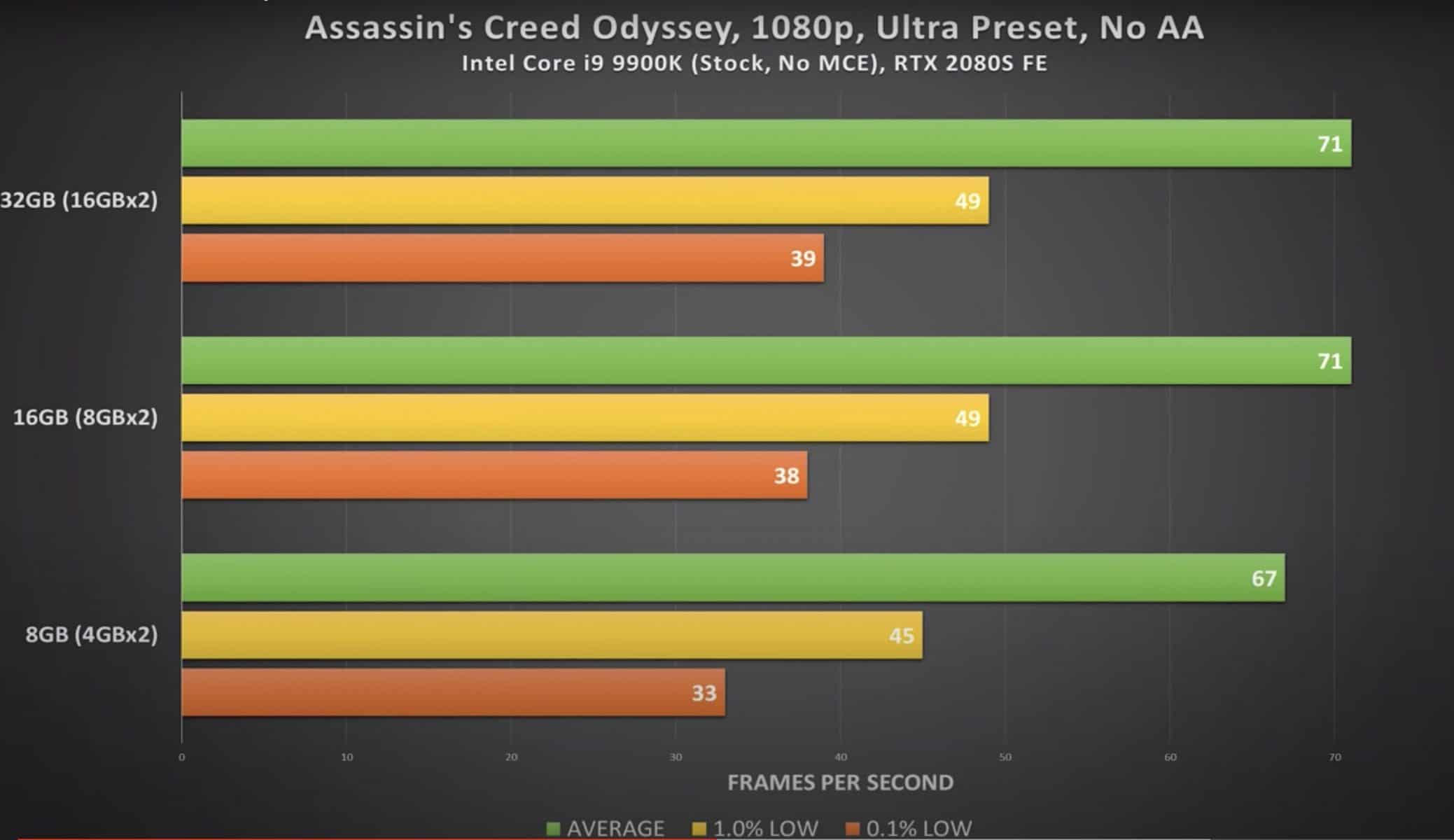 Portanto, para perceber qual é a melhor quantidade para o seu caso, vamos ver a performance de 3 dos jogos mais populares dos últimos anos, GTA V, AC: Odyssey e Shadow of the Tomb Raider. Este teste foi feito com memória DDR4 Corsair, todas com os mesmos timings, o mesmo sistema e a mesma frequência (3000MHz). Ora veja: