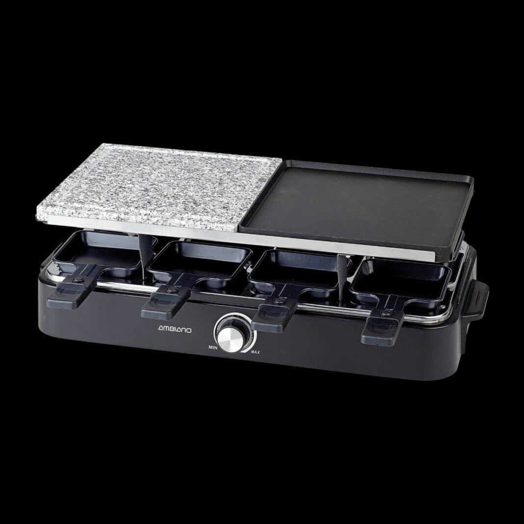 Os grelhadores Raclette são aparelhos de bancada versáteis que podem cozinhar uma variedade de alimentos na placa superior, ao mesmo tempo que aquecem tabuleiros de tamanho individual por baixo, cheios de queijo para derreter ou vegetais para grelhar. São bastante fáceis de utilizar (alguns têm apenas um interrutor para ligar/desligar!), podem ser utilizados para uma variedade de alimentos (carne, legumes, ovos, etc.) e não costumam ser muito caros.