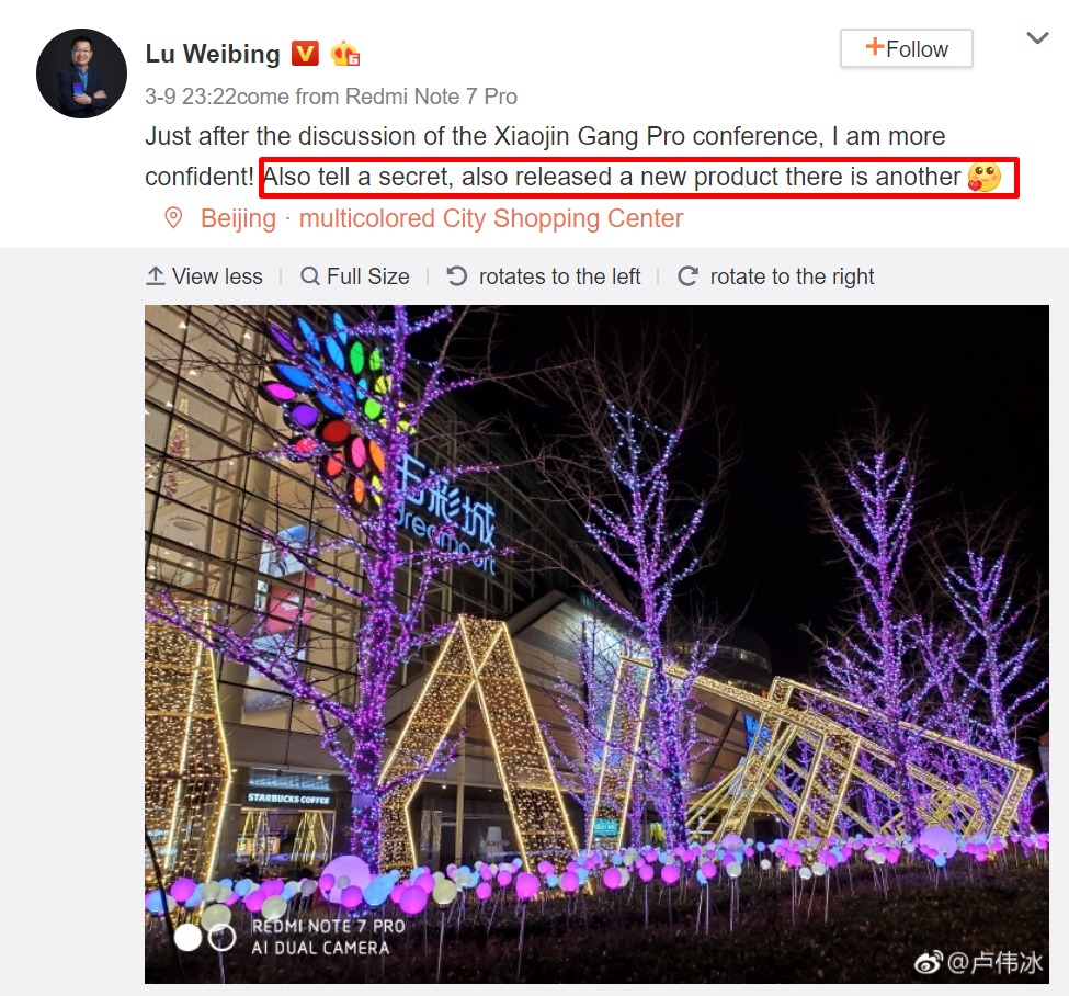O presidente da Redmi, Lu Weibing, confirmou através de um post no Weibo que esta empresa vai lançar um novo equipamento juntamente com o Redmi Note 7 Pro. Este dispositivo será lançado na China no dia 18 de março. Entretanto, se considerarmos que já conhecemos praticamente todas as especificações e imagens do Redmi 7 que entretanto apareceram na TENAA, especula-se que este possa ser o equipamento mistério.