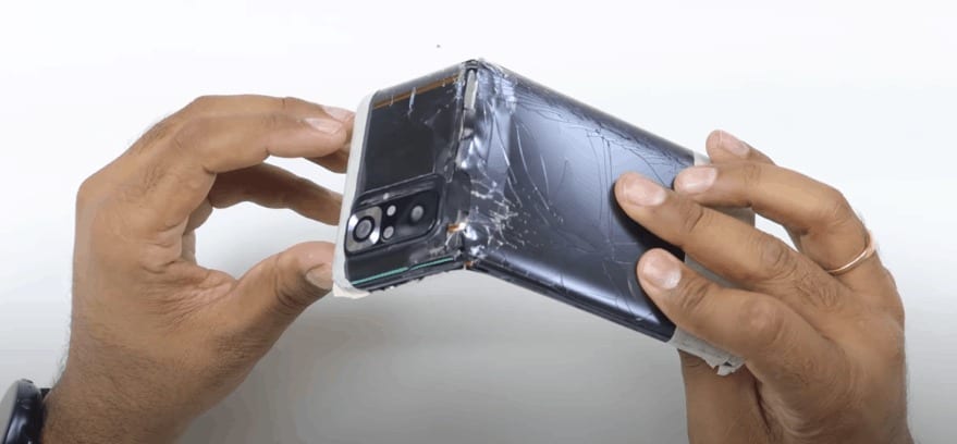 Nesta altura, o dispositivo já está completamente partido. Para proteger as mãos, o YouTuber cobriu o ecrã com um protetor. Entretanto o YouTuber tenta dobrar o Redmi Note 10 Pro a aplicar pressão a partir do ecrã. Ora ele dobrou-se logo em duas partes como se fosse um dobrável. Isto significa uma coisa. Se o tiver no bolso traseiro ele vai dobrar facilmente.
