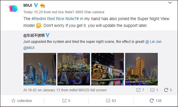 A Xiaomi confirmou esta informação na página oficial do MIUI no Weibo, quando um cliente disse que gostaria de ter o modo noturno no Mi Mix 2s.