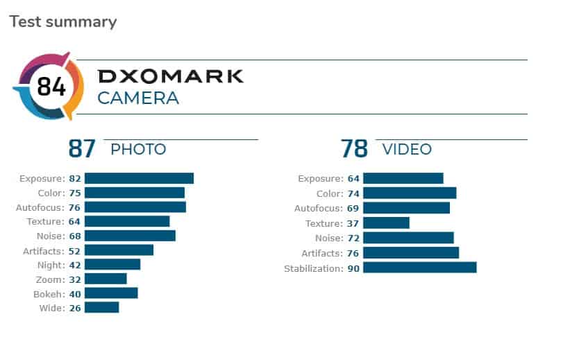 A pontuação está dividida em 87 pontos para foto e 78 pontos para vídeo. A análise afirma que mesmo com a câmara de alta resolução, há uma falta de detalhes nas imagens. Ele também possui um alcance dinâmico limitado que “resulta num recorte ao fotografar em situações difíceis de alto contraste”. O smartphone também não pode tirar fotos com zoom detalhado, pois não possui uma lente telefoto dedicada e suas fotos grande angular também apresentam um baixo nível de detalhes devido à falta de alcance dinâmico.