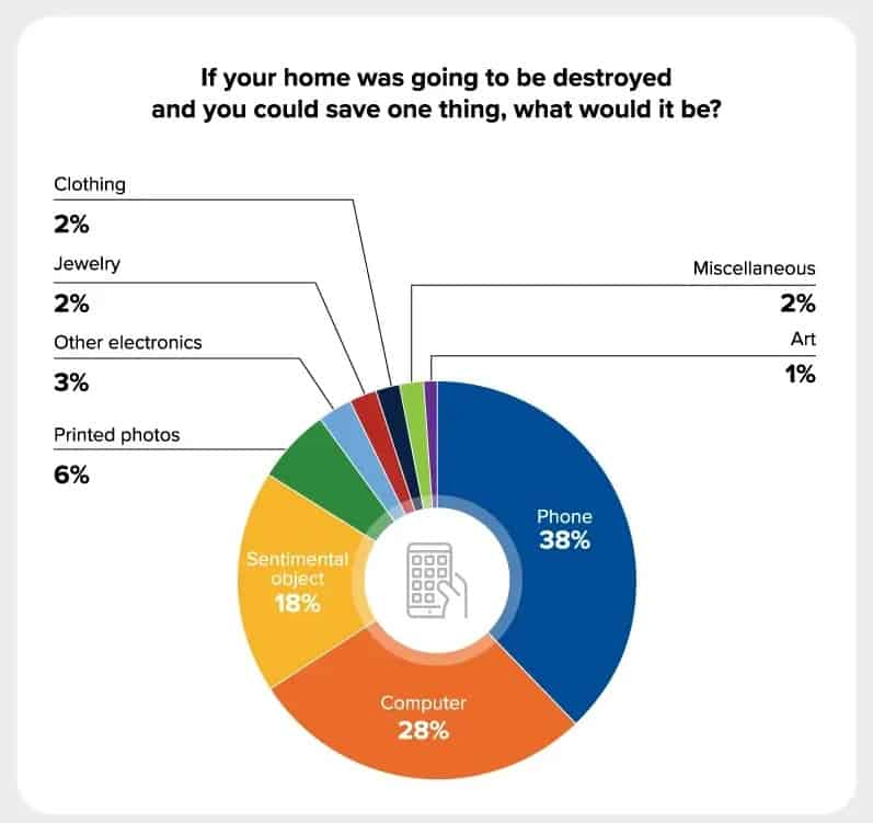 Assim 38% dos inquiridos disseram salvariam o smartphone. Ou seja, a maioria. Já 28% disseram que a única coisa que salvariam seria o computador. Combinamos, 66% estão mais preocupados em salvar os elementos digitais no meio de um incendo, ao contrário de outras coisas, como fotografias.