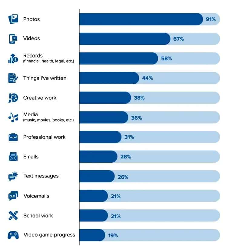 Outros ativos digitais preciosos incluem coisas que escreveram (44%), trabalho criativo (38%), media (36%), trabalho profissional (31%), correio (28%), textos (26%), mensagens de voz (21%), trabalho escolar (21%) e videojogos (19%).
