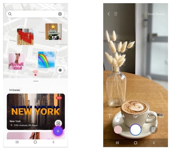 O Editor de Cenas da app inclui opção de adicionar texto 3D, imagens 2D e GIFs juntamente com uma opção que nos permite pintar livremente.